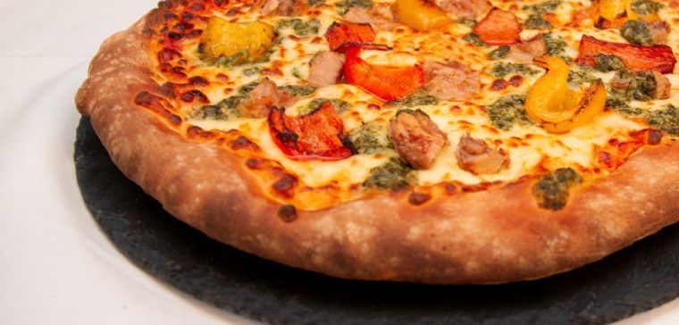 Coulis de tomate, mozzarella, poivrons grillés, thon au naturel, persillade.