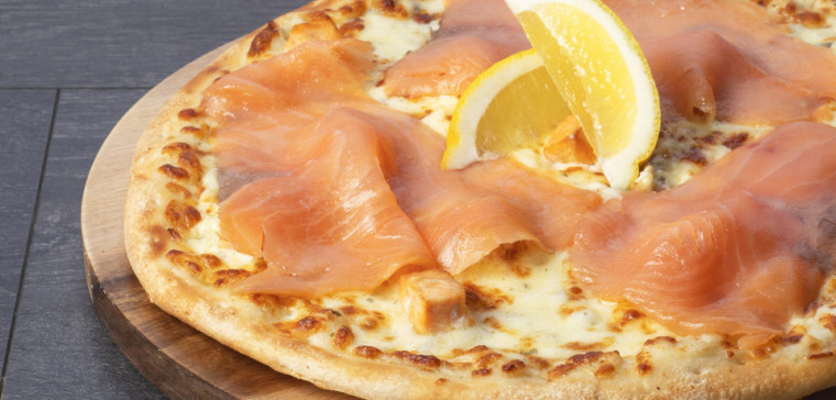 Crème fraîche, aneth, mozzarella, saumon. Ingrédients ajoutés après cuisson : belles tranches de saumon fumé, citron.